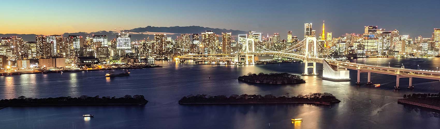 Odaiba est un regroupement de plusieurs îles artificielles et est un des endroits les plus populaires de la capitale. Ce lieu est connu pour sa diversité, ses activités, ses centres commerciaux, ses statues emblématiques et ses événements. C’est un lieu aussi très apprécié pour sa promenade nocturne, en face de l’impressionnant Rainbow Bridge illuminé.